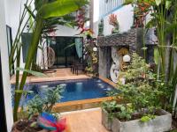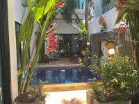 Courtyard with small private pool featuring a swim-up bar, in-water bar stools, water features, plants, and LED lighting